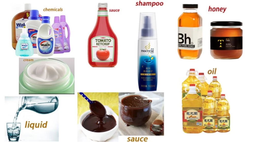 Chất lỏng bán nhớt và nhớt; catup, mù tạt, xi-rô, salsa, mayonnaise, mật ong, bơ đậu phộng, thạch, nước chấm, son dưỡng môi, dầu gội, xà phòng dày, gel tạo kiểu, mặt nạ, sáp, keo, mỡ, keo, silicone và nhiều hơn nữa